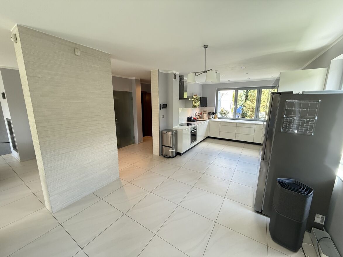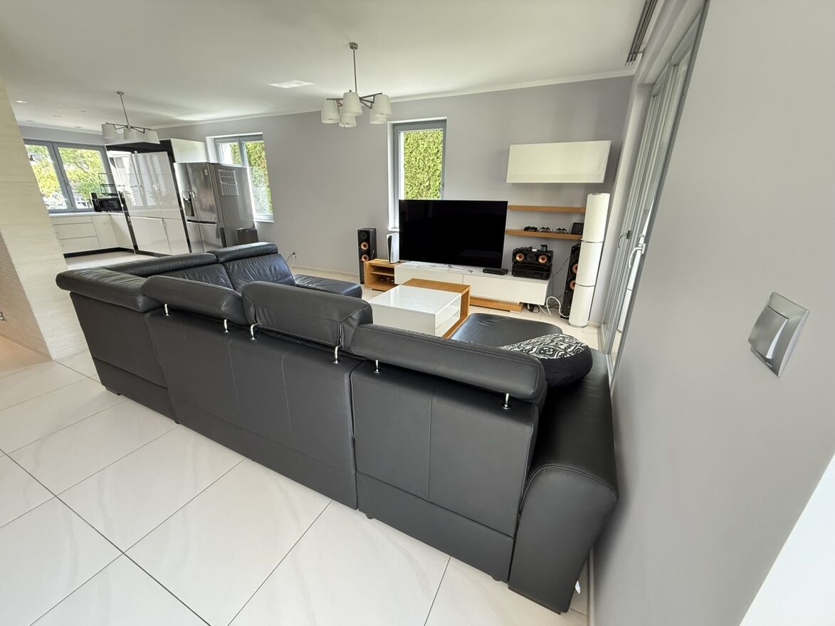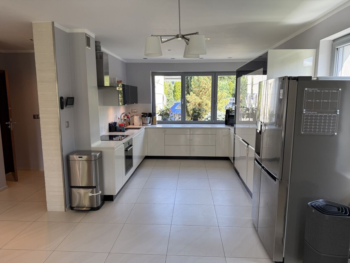 Dom wyróżnia się wysoką jakością wykończenia i nowoczesnym designem. W 2025 roku odświeżono wnętrza – pomalowany parter, piętro oraz klatka schodowa. W całym domu działa bezprzewodowy internet Wi-Fi oparty na architekturze UniFi (5 punktów dostępu Ubiquiti U7 PRO), a monitoring zarówno zewnętrzny jak i wewnątrz zapewnia bezpieczeństwo domowników.